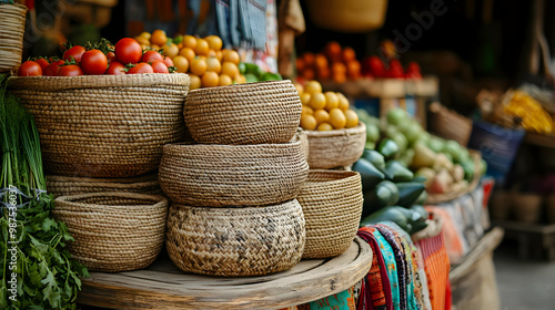 Fototapeta premium Colorful display of fresh fruits and vegetables in woven baskets at a market.