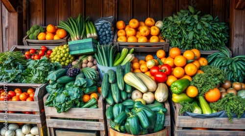 © Chom, Obraz premium Colorful Display of Fresh Vegetables and Fruits in Rustic Market Baskets Surrounded by Wooden Background