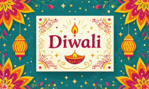 © NguynTh, Naklejka premium Colorful diwali greeting card with ornate lanterns and floral patterns on teal background