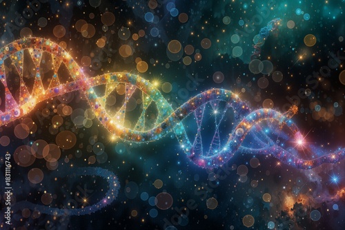 Fototapeta premium Colorful dna double helix against cosmic background, illustrating genetic diversity and complexity
