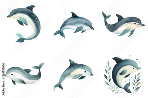 © Ekaterina, Naklejka premium Colorful dolphins in various poses illustrated with natural details, set