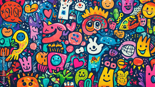 Obraz premium Colorful Doodle Art Background Fun Cartoon Characters Happy Bright Design