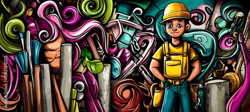 © BerkahStock, Obraz premium Colorful doodle art of a worker amidst tools and paint.