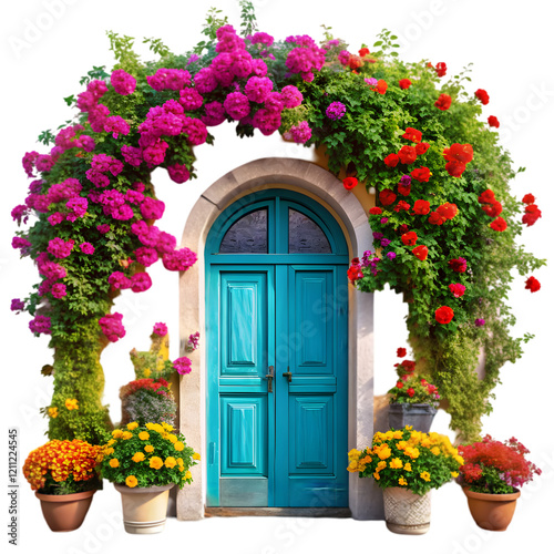 © Natasha, Naklejka premium colorful door with arched window and flowers
