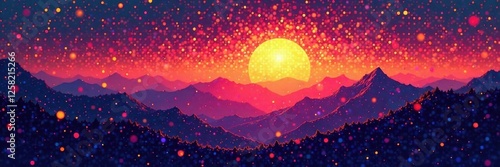 Naklejka premium Colorful dots arranged in a grid forming an image of a sunset over mountains,...