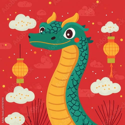 Naklejka premium Colorful Dragon Character with Lanterns and Clouds on a Red Background, Symbolizing Good Fortune and Celebration in Asian Culture