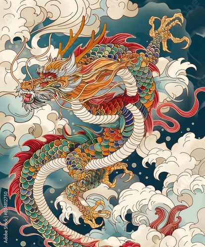 Naklejka premium Colorful Dragon Soaring Above Waves and Clouds in Traditional Japanese Art