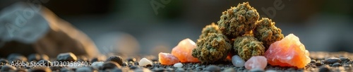 © photohappy, Fototapeta premium Colorful dried marijuana buds stacked with Himalayan salt, himalayan salt, rocky terrain