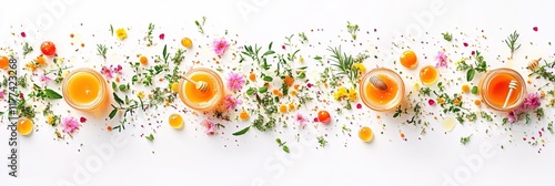 © Duskcraft, Obraz premium Colorful Drinks Surrounded by Fresh Ingredients and Vibrant Flowers on White Background