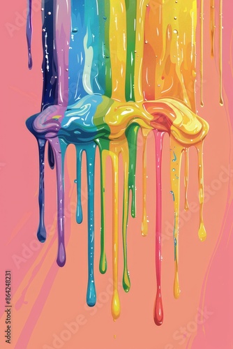 Naklejka premium Colorful dripping paint in rainbow hues on a pink background, creating a...