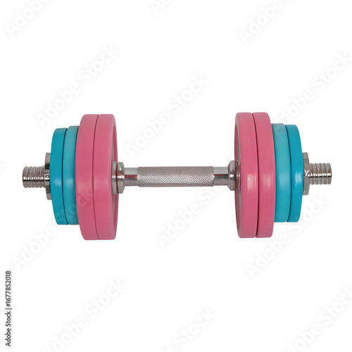 Naklejka premium Colorful dumbbell with pink and blue weights on metal handle, isolated on transparency background, perfect for fitness and exercise themes