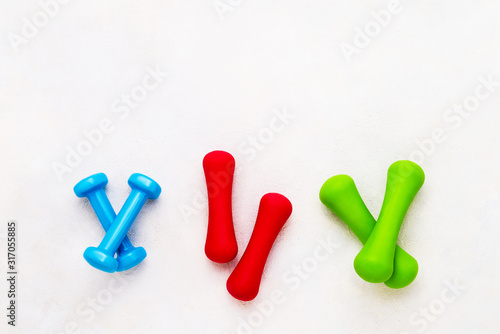 © Laima Gri, Naklejka premium Colorful dumbbells lie on concrete background. The concept of healthy lifestyle. Copy space, top view