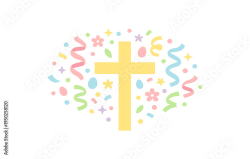 © 4zevar, Obraz premium Colorful easter cross with pastel confetti and symbols celebration graphic