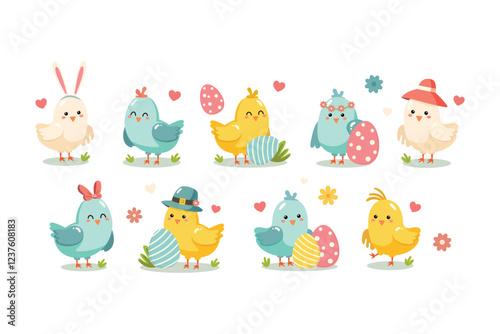 © siraanamwong, Naklejka premium Colorful easter cute chicks birds character