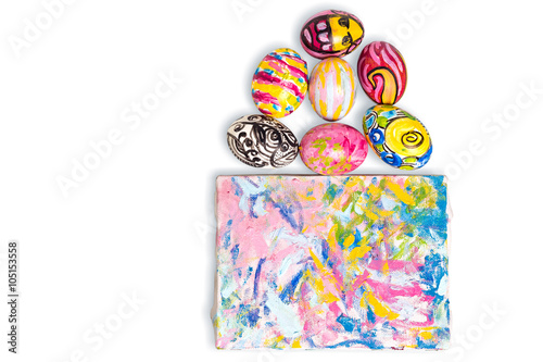 Fototapeta premium Colorful easter egg and small painted canvas on white