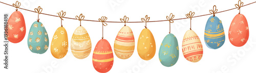Fototapeta premium Colorful Easter egg garland with patterns hanging on string for festive...