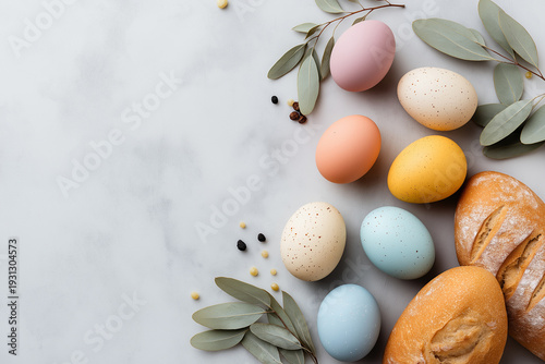 Fototapeta premium Colorful Easter eggs and fresh bread arranged beautifully in a spring...