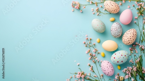 Fototapeta premium Colorful easter eggs and pink flowers creating a festive border on light blue background