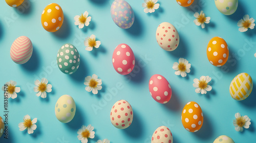 Fototapeta premium Colorful easter eggs and white flowers creating a festive pattern on a light blue background