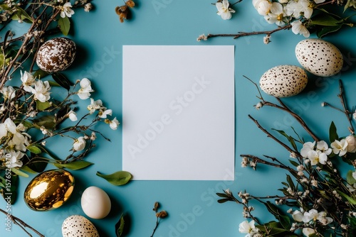 Fototapeta premium Colorful Easter Eggs Arranged Around a Blank Card on a Teal Background With Flowers and Branches