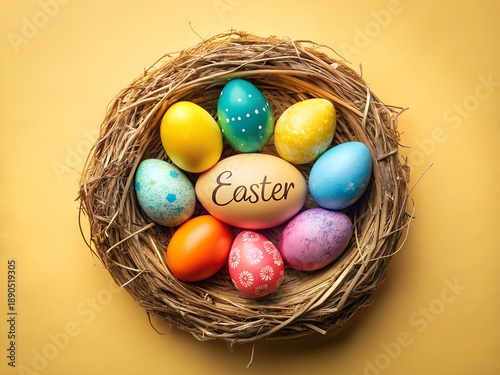 © Photo Studio, Obraz premium colorful easter eggs arranged in rustic nest with festive spring holiday decoration on bright yellow background