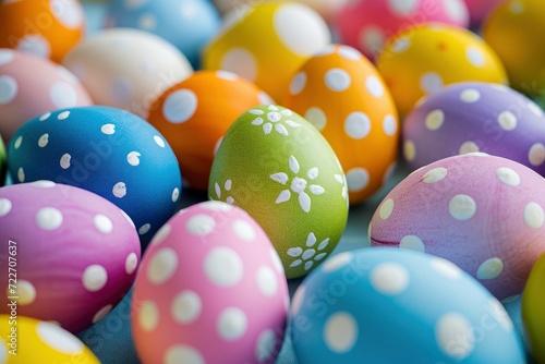 © MdBaki, Obraz premium Colorful Easter Eggs Background, A Festive Display Enhancing the Easter Bunny Concept.