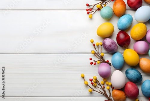 © Eva13186707, Obraz premium Colorful Easter Eggs Border on White Wood Background