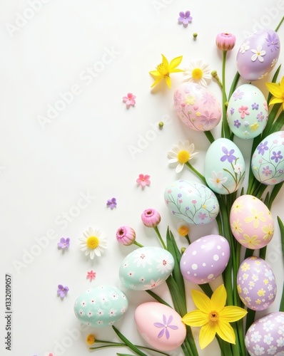 © Asawin, Fototapeta premium colorful easter eggs decorated with floral patterns among spring flowers and greenery