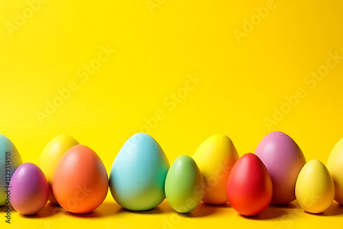 © MRSUTIN, Obraz premium Colorful easter eggs displayed on bright yellow background festive decor studio setting