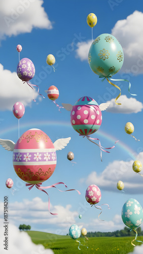 Fototapeta premium Colorful Easter eggs floating in the sky with a rainbow over a green field on...
