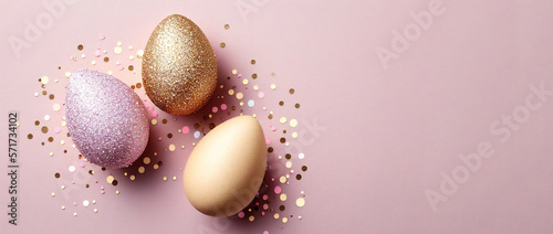 Fototapeta premium Colorful Easter eggs. Golden glitter painted eggs on pink background with copy space. Illustration AI