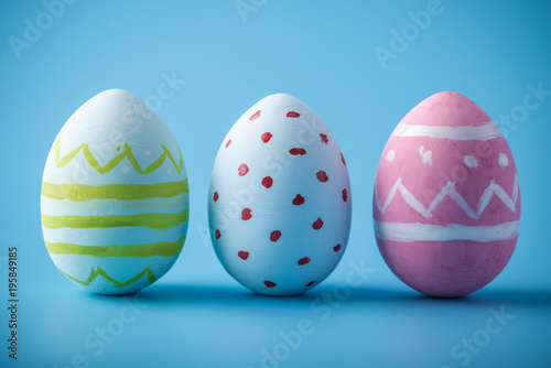 © Artem, Fototapeta premium Colorful Easter eggs hand painted on a blue background. Holiday spring card