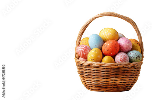 Naklejka premium Colorful easter eggs in a rustic woven basket spring holiday decoration food gift card happy image photo on transparent background