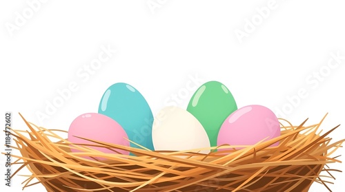 Naklejka premium Colorful Easter eggs in a straw nest on a white background