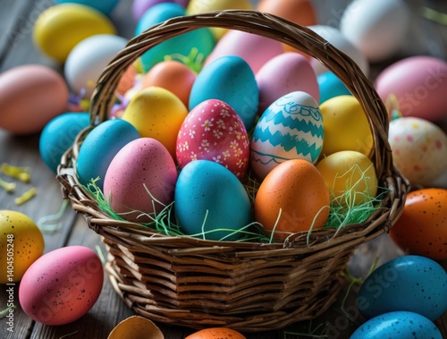 Naklejka premium Colorful Easter Eggs in Basket - Festive Spring Holiday