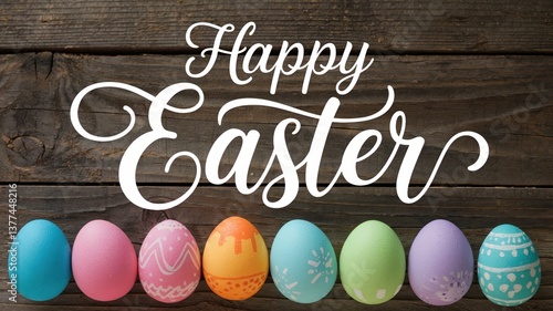 © Picstings, Fototapeta premium Colorful Easter eggs lined up on wooden surface below 'Happy Easter' text in elegant script.
