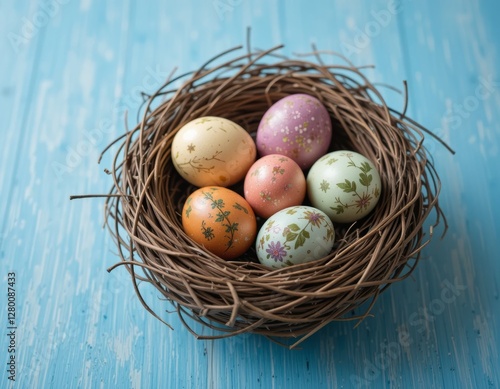 © Olesya, Obraz premium Colorful Easter Eggs Nestled in a Cozy Nest on a Solid Background