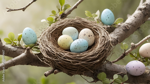 Fototapeta premium Colorful Easter eggs nestled in a natural nest on a tree branch, surrounded...