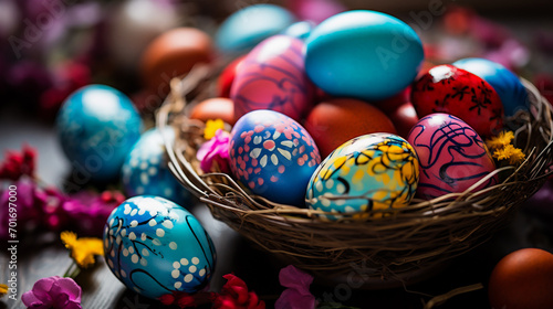 © Jioo7, Fototapeta premium Colorful easter eggs on rustic wooden background
