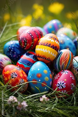 © Boss, Obraz premium Colorful Easter Eggs over a Grass Floor during Midday.
