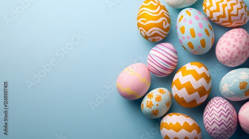 © Shehub, Fototapeta premium Colorful Easter Eggs Pattern on Blue Background