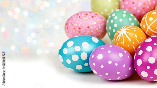 Obraz premium Colorful Easter Eggs with Dotted Patterns arranged on a white surface with bokeh background.