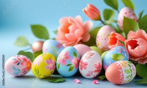 Fototapeta premium Colorful easter eggs with floral patterns surrounded by peonies on a bright background