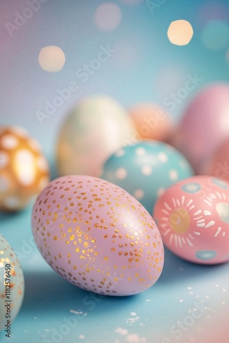 © Atmospheric stock, Obraz premium Colorful easter eggs with gold patterns on blue background
