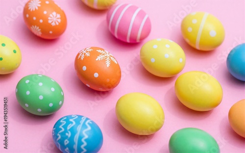 © joeycheung, Obraz premium Colorful Easter eggs with patterns scattered on a soft pink
