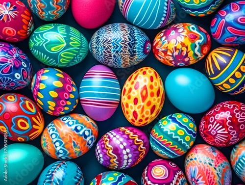 © NAVIN, Obraz premium Colorful Easter eggs with patterns top view - ai generative