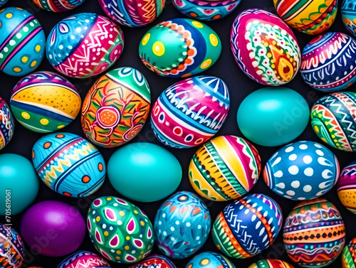 © NAVIN, Obraz premium Colorful Easter eggs with patterns top view - ai generative