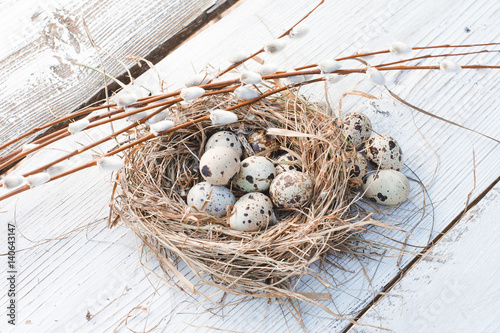 © Kanstantsin, Obraz premium Colorful Easter quail Eggs with willow twigs on the white rustic wooden background in nest