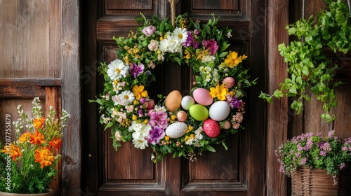 © SETSU 21, Fototapeta premium Colorful Easter Wreath with Flowers and Eggs on Wooden Door