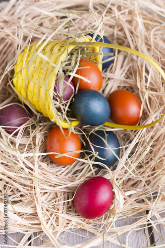 Fototapeta premium Colorful eastern eggs. Copy space. Selective focus